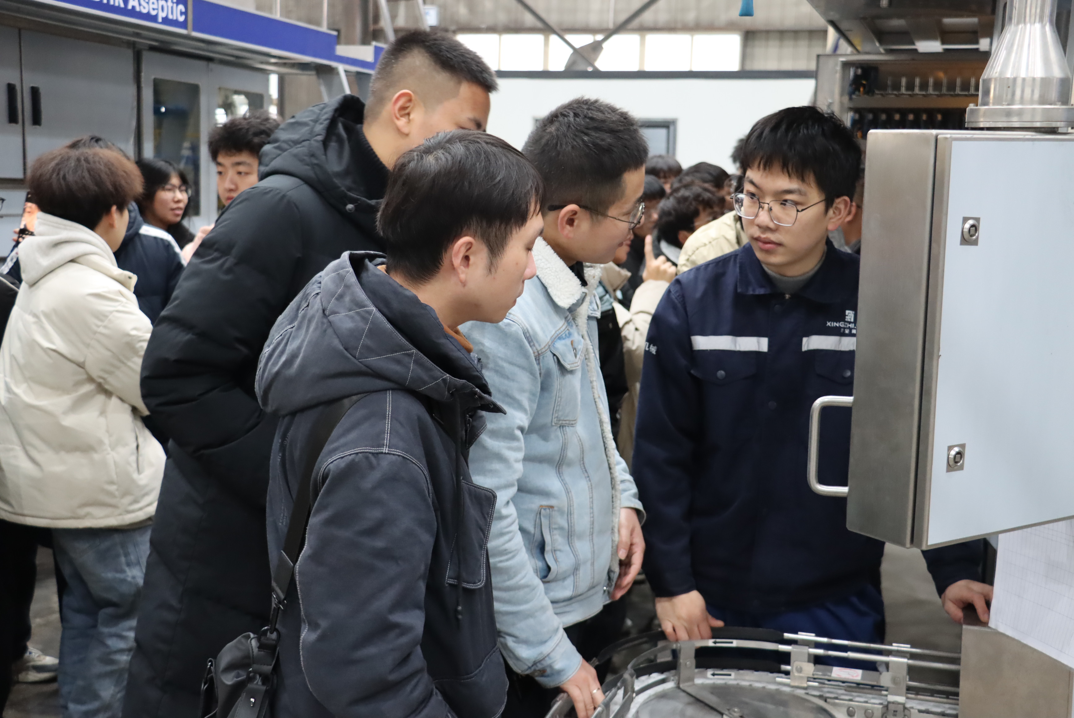 認(rèn)知實(shí)習(xí)現(xiàn)場(chǎng),學(xué)生展現(xiàn)出對(duì)灌裝機(jī)運(yùn)行的濃厚興趣,踴躍向工程師請(qǐng)教。